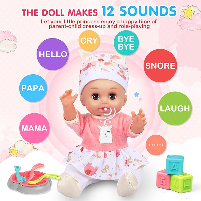 - Friendly & Safety Material: All the doll accessories are made from safe, durable, non-toxic materials, ensuring that these are safe for kids to play with. The doll toy will make 12 kinds of sounds, your little princess will enjoy the happy time of parent-child pretend role play