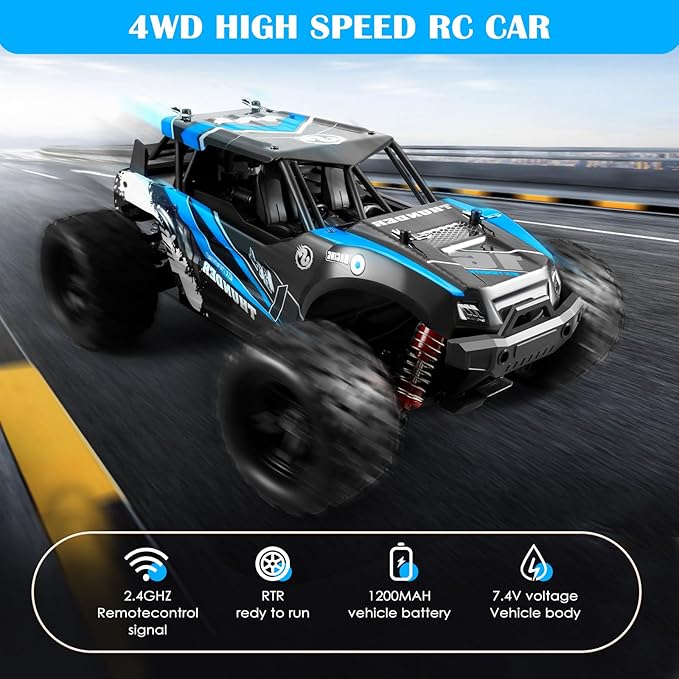 - Safe & High quality:This high-speed remote control car adopts a flexible and strong PVC truck body, front and rear independent suspension design, with elastic and durable strong oversized non-slip rubber wheels and metal shock absorbers, with good grip and good cushioning effect, you can easily Drive on all terrains such as rocks, sand, grass, concrete roads, etc., providing a real off-road racing experience for all lovers.