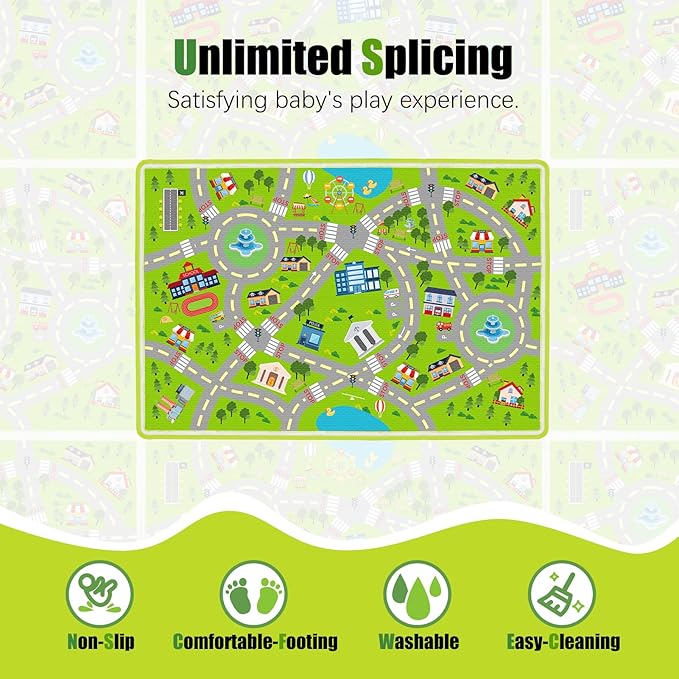 - 【Non-Slip Kids Playroom Carpet】 We've upgraded the material of the car play rug - made of special yarn with dots on the bottom to enhance the non-slip performance. The entire playroom carpet is soft, non-slip and not easy to fade, and can withstand long-term use. Dirt and debris can be easily removed by wiping with a vacuum cleaner or a damp cloth, and machine washing can be thoroughly cleaned.