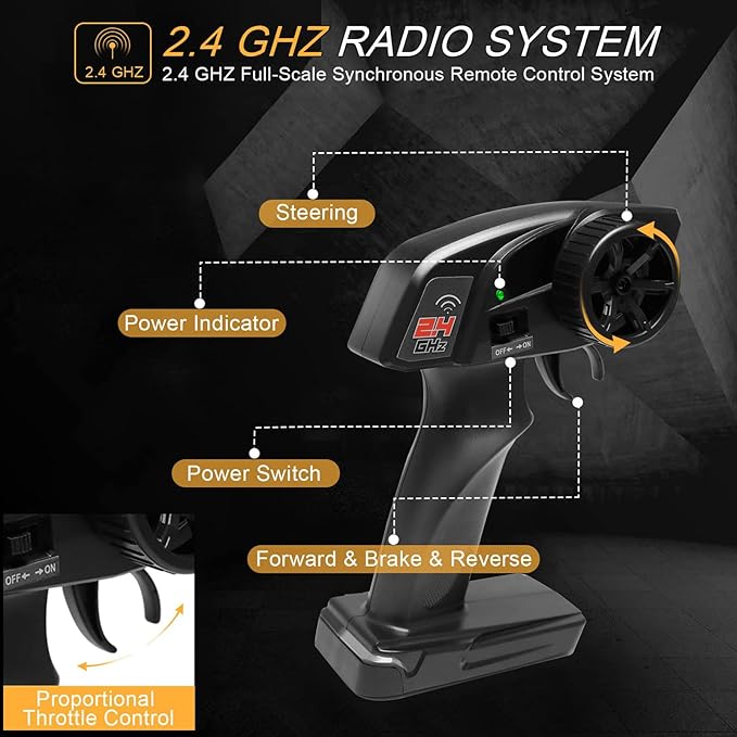 • 2.4GHz Anti-Interference Remote Control:Equipped with 2.4GHz remote control system with stable signal and proportional throttle and speed control; multiple vehicles can be driven at the same time without interfering with each other, and the remote control distance can reach 30 meters.