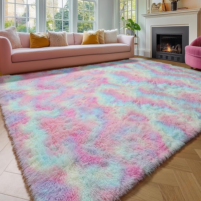Amdrebio Rainbow Unicorn Colorful Kids Rugs for Girls Bedroom, 8x10 Fluffy Shag Area Rugs for Playroom Classroom, Large Pastel Room Decor Aesthetic, Cute Fuzzy Kawaii Princess Carpet for Baby Toddler