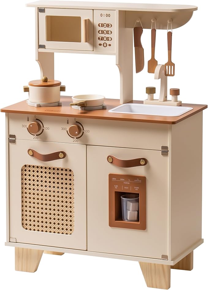 • Hands-On Fun & Learning: Create an interactive world with our Wooden Play Kitchen! Touch-sensitive controls on the back spark imagination, letting your child play chef with simulated cooking. This hands-on play boosts brainpower, making learning a blast!