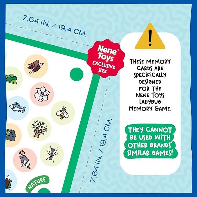 • โš ๏ธ EXCLUSIVELY SIZED FOR NENE TOYS: These memory cards are a unique size, specifically designed for the Nene Toys Ladybug Memory Game. Measuring 7.64 inches x 7.64 inches (19.4 cm x 19.4 cm), they cannot be used with other brands' similar games!