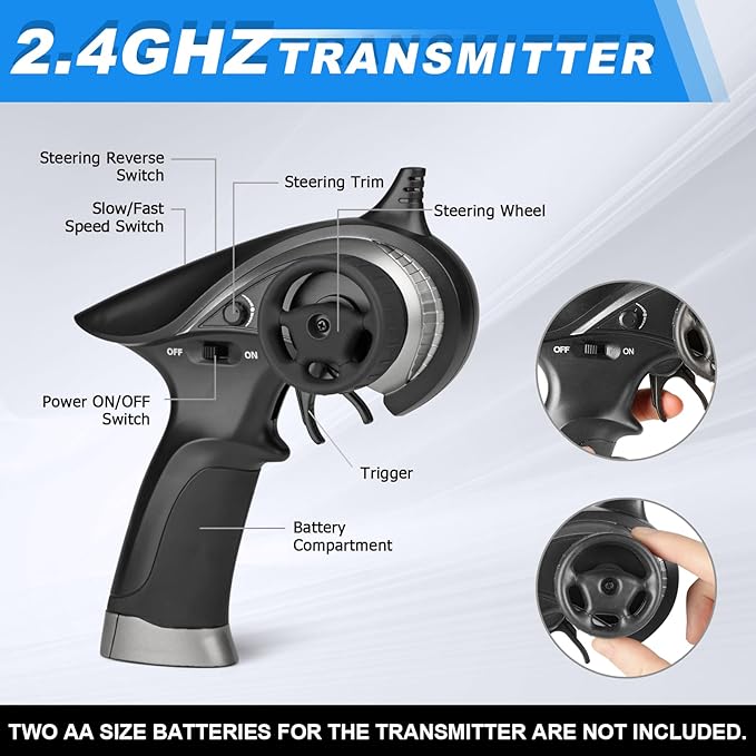 - Multiplayer Racing Fun: The 80-meter control range 2.4GHz transmitter enables you to organize thrilling multiplayer races with friends and family. The speed control embodies splash waterproof protection, thermal protection, low voltage cutoff. The system has two-speed adjustments, making this remote control drift car ideal for both adults and kids.