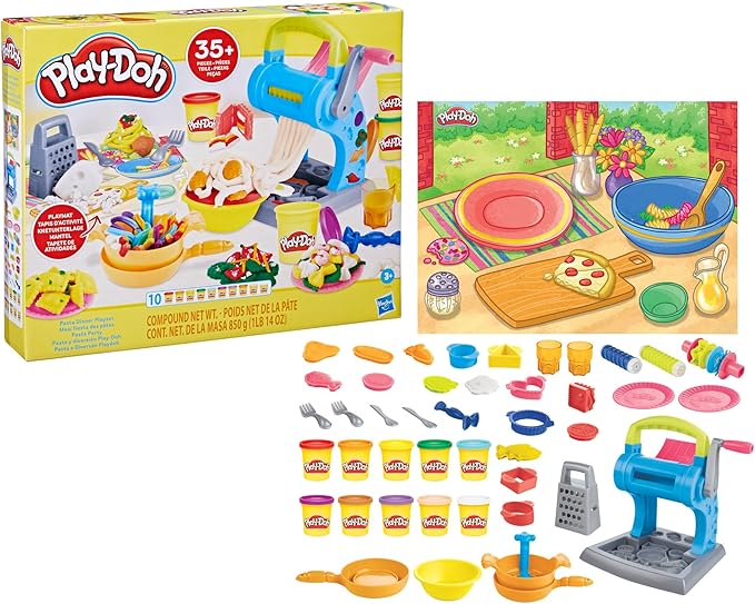 • 35+ PLAY KITCHEN ACCESSORIES INCLUDING PLAYMAT: Create make-believe macaroni with the pasta pot, stamp pretend ravioli with the book-mold, grate Play-Doh Parmesan with the cheese grater, set up an imaginary feast on the playmat, and so much more!