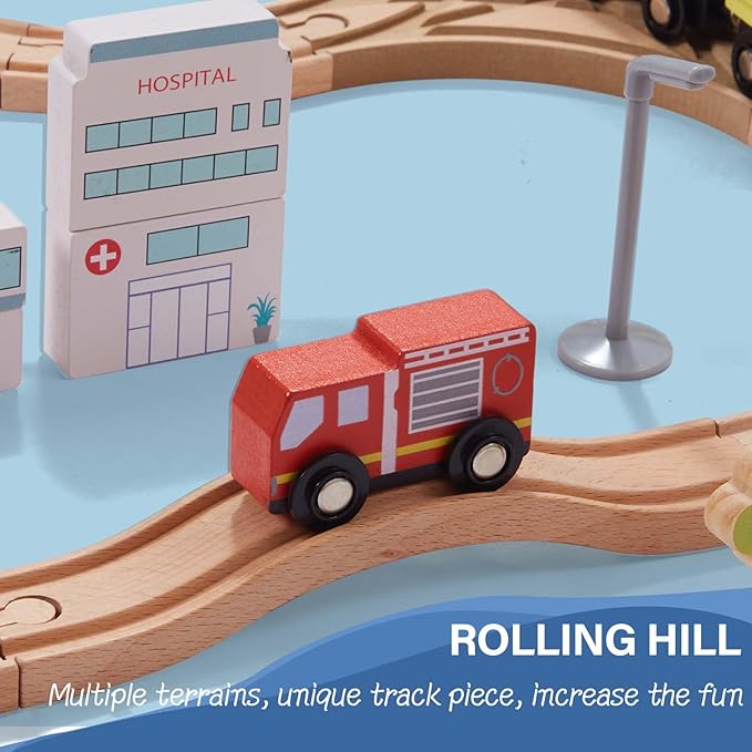- ๐ใMulti Scenes Triple the FunใThis Deluxe Train Track Set also contains 3 themed playing sets including hospital, doctor and ambulence set, fire station fire truck and firefighter set, police station, police man and dog,prisoner, police car and helicoper set. It is truly a exciting city full of stories and waiting for the little train lover to explore!