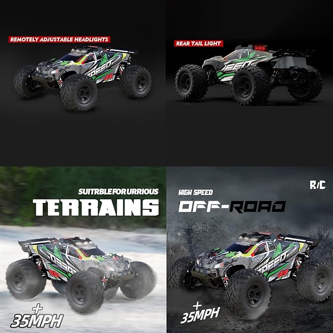 - 【1:10 Large Size & Led Head and Tail Lights】1:10 RC truck equipped with realistic LED headlights and taillights, making your adult RC car cool and charming, and can identify the hobby rc cars driving direction and operate in dim lights Detects the terrain, bringing an incredible night driving experience; the four wheels of the fast rc car are made of bouncing spring material, which can support accidental drops and unstable ground, allowing you to enjoy the high-speed RC off-road vehicle longer
