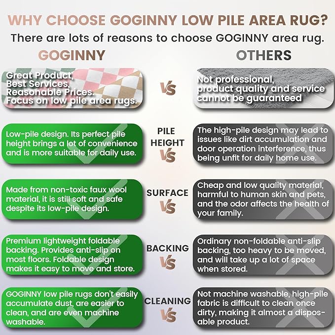 - 【SKIN & PET FRIENDLY MATERIALS】Selected high-quality materials, safe and non-toxic, does not contain chemicals that may be harmful to health. This low pile rug also make pet dander and hair won't get trapped inside, pets' paws won't get snagged or get caught on edges.