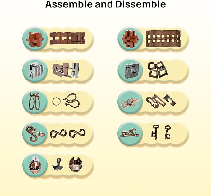 • [BRAIN TEASER PUZZLES ADULTS, TEENS, AND KIDS] Zinc alloy 3D metal puzzles and 3D wooden puzzles are smooth for brain game. Brain teaser wires hand puzzles are a healthier way to passing time, assembly puzzles and disentanglement puzzles, practice focus and concentration, get them as an IQ test challenge game in limited time, bring lots of thinking fun.