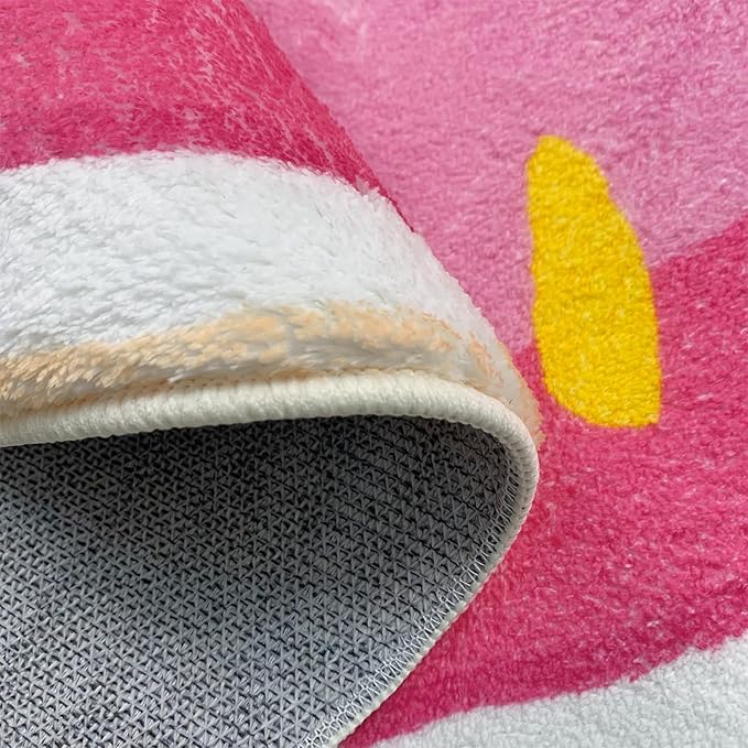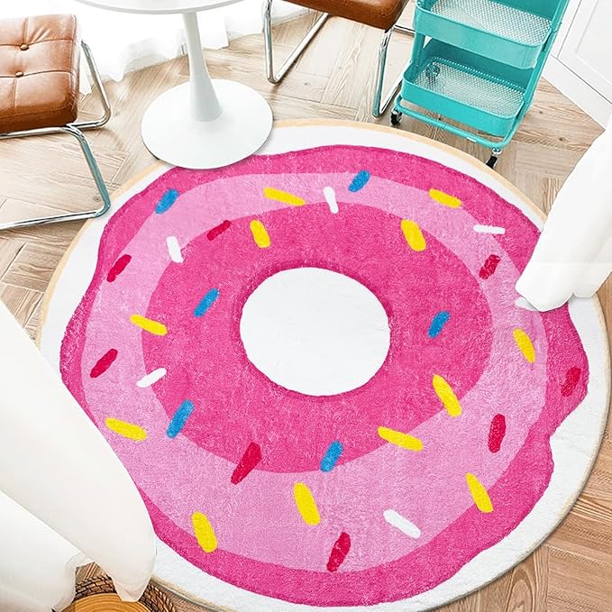 - Kids Rug Size and Material: This round doughnut area rug measures 47.2" or 120 cm, perfect for kids bedroom or playroom; Made of polyester fiber, the surface of this cute cartoon donut rug is ultra soft, durable and skin-friendly, good as play carpet, baby crawling mat, bumper pad or bedside rug; With LATEX backing, this 4ft circle rug is nonslip, not easy to move, very easy to fold and wash