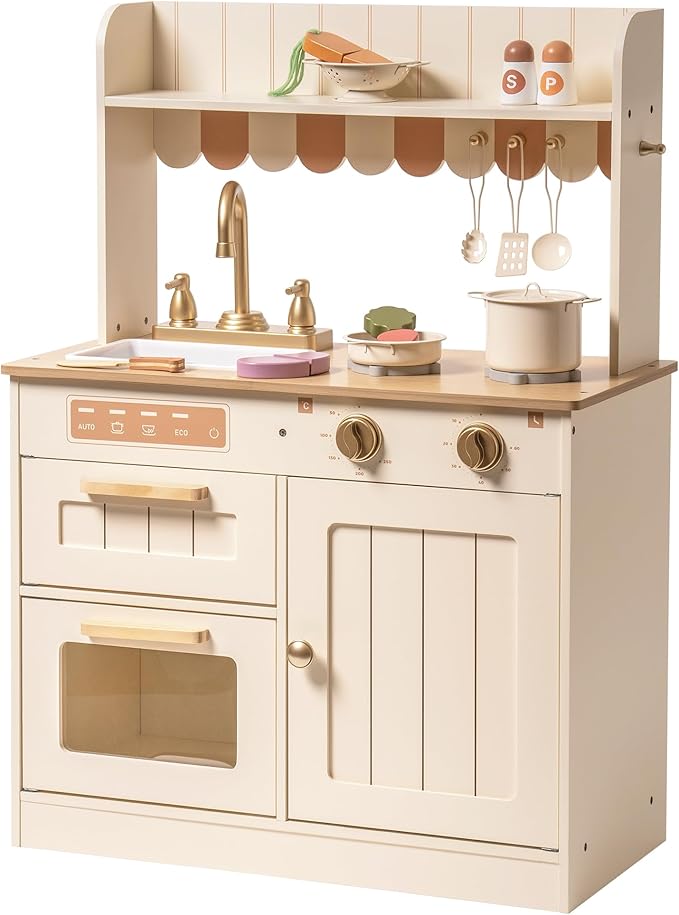 • Stylish Aesthetics: Our play kitchen's soft beige color and gleaming gold faucet create an elegant and modern design that complements any playroom or nursery.