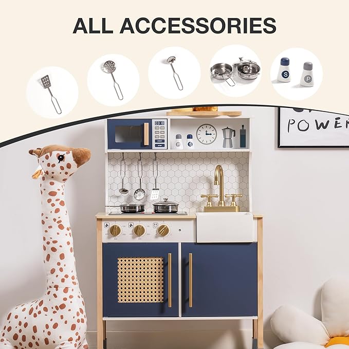 - [Built to Last]: Crafted from solid wood, our Kids Pretend Play Kitchen Playset ensures durability and sturdiness. The unique vintage rattan design adds a touch of style. Follow the hassle-free assembly instructions, and rest assured it won't fall apart.