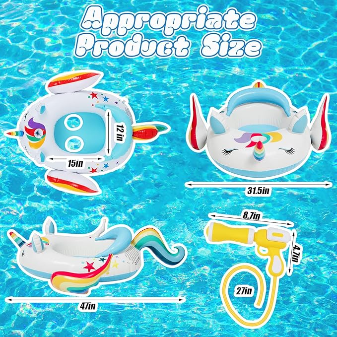 - CUTE UNICORN DESIGN---The Inflatable swimming pool is inspired by unicorn, bright and vibrant color can quickly attract attention in the crowd. Ride on the pool float, you can play with rocket!