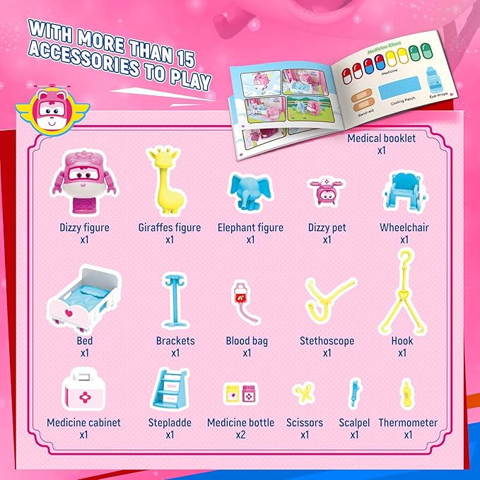 Super Wings Dizzy Rescue Helicopter Hospital Playsets,Airplane Pet Care Play Sets Doctor Kit for Kids 3-5, 20+ Accessories Pretend Dr Kit for Toddlers, Gifts for Girls Boys 3-7 Years Old