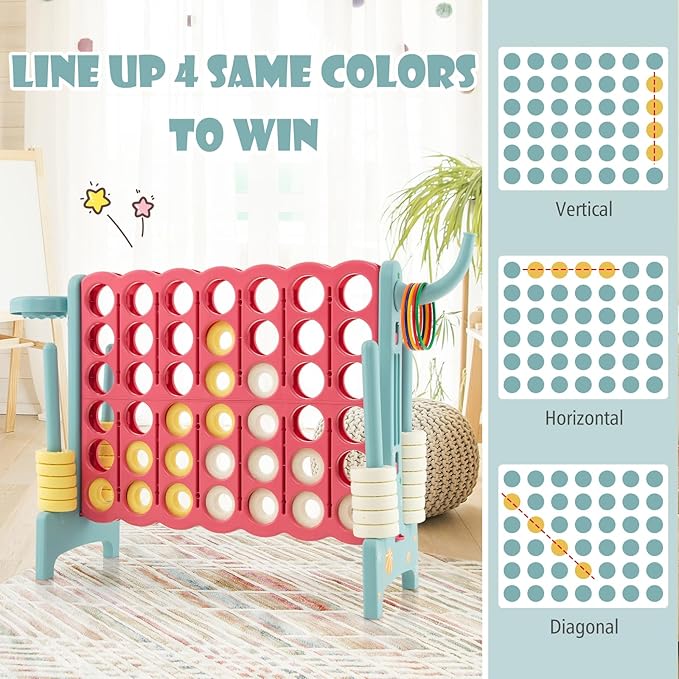 - 【Perfect Gift for Kids】: Our colorful giant game toy is the perfect gift for children. Whether it’s holiday or birthday, this 4-in-a-row game set is always a surprise and will keep them entertained for hours. The rules are very simple and children can learn them quickly. Besides, through this game, children's motor skills, hand-eye coordination and cognitive skills can be greatly improved.
