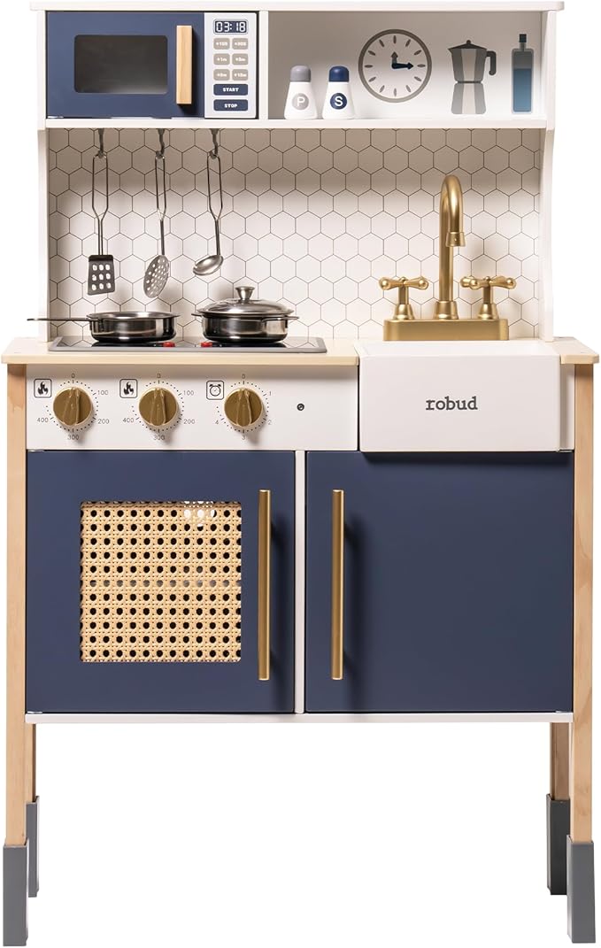 • TIMELESS RETRO ELEGANCE: Immerse your child in a world of vintage charm with the ROBUD play kitchen. Its American retro design, highlighted by a gleaming golden faucet and striking sapphire blue accents, makes it a standout piece in any playroom. It's more than just a toy—it's a stylish statement.