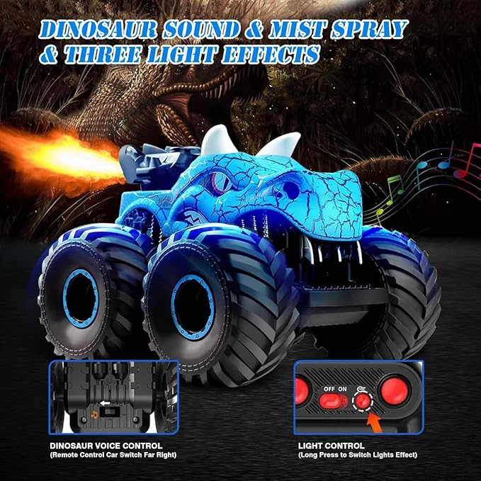 Remote Control Monster Truck, 2.4GHz RC Cars with Light, Sound & Spray, Monster Trucks for Boys Girls, All Terrain Dinosaur Toys with 4 Batteries, Festive Birthday Gifts