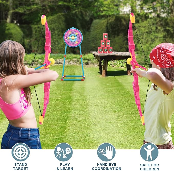 2 Pack Kids Bow and Arrow Set, Pink Light Up Archery Toy Set, 2 Foam Dart Guns & 6 Target Cans Toys for Ages 5-7, Kids Indoor Outdoor Birthday Gifts Ideas for Boys Girls 4 5 6 7 8 9 10 Year Old