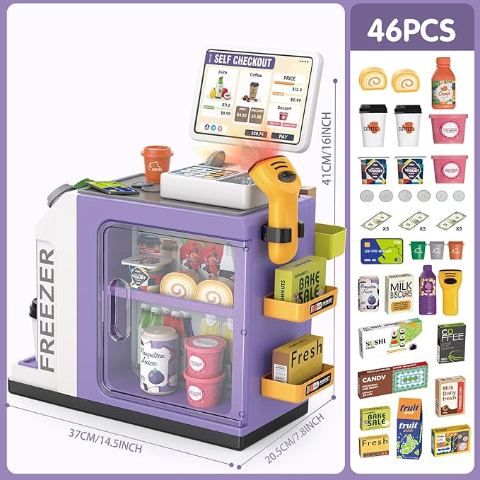 - 【Super Valued Set】Sotodik Cash Playset includes 46 pcs kits of toy coffee machine, refrigerator and cash register with sound and light,also include play foods, bar code scanner, credit card, cups, coins,play money and an apron.It offers endless fun for kids of imaginative play.