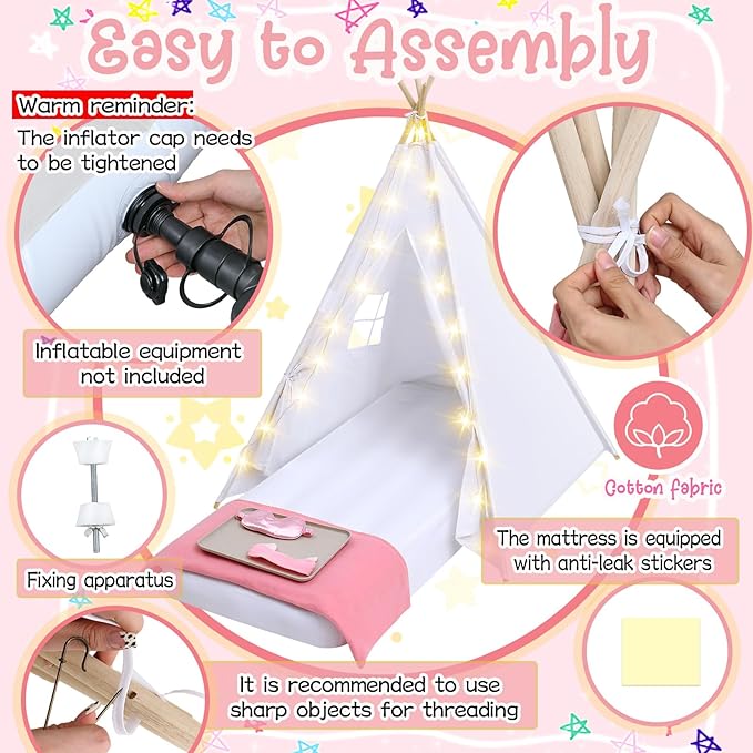 - Effortless Assembly: our children's tents are a breeze to set up; With 8 pine poles and 4 connectors, you can easily create four 1.6 m/ 5.25 ft long poles; Simply insert these poles into the fabric, unfold, and you're ready to assemble; Inflating the bed is equally simple with an air pump (not included), and the fitted sheets ensure a clean and comfortable sleep; Hanging the star string lights is as easy as installing 3 AA batteries, making it your warm companion at night