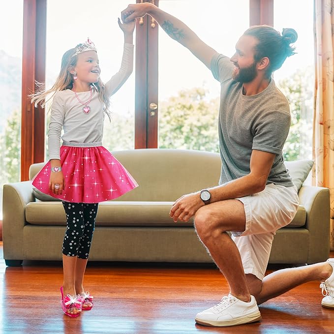 - Dress up Shoes for Girls Toys - Included in this enchanting set are 3 different color skirts, 3 color toddler-sized heel princess shoes, 3 princess tiaras, 3 princess jewelry, 3 necklaces, 3 rings and 3 earrings. The skirts are available in different colors and styles, perfect for twirling and dancing.
