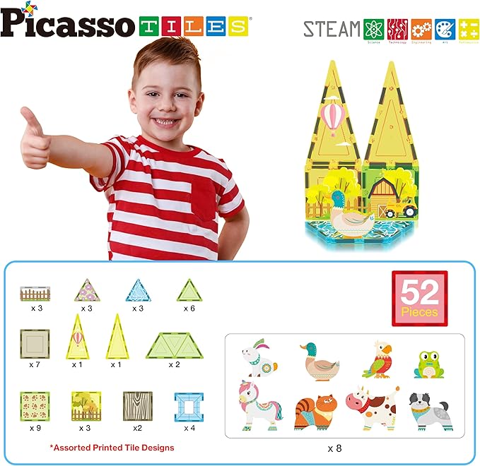 - LEARNING BY PLAYING: Our farm animal-themed building toy set not only delivers hours of fun but also fuels STEAM education allowing kids to explore their creative side while still engaging their brain. PicassoTiles toys naturally enhance fine motor skills, bilateral coordination, and cognitive abilities when experimenting with magnetized tiles through storytelling. This kit is a great addition for preschool activities or at-home play. Exhilarate playtime and stimulate young minds.