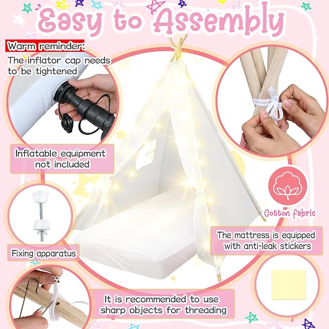 • Sturdy & Durable: made from quality cotton fabric, our machine-washable kids tent indoor is supported by solid pine poles for stability; The flocked air mattress inflates quickly, while the fitted sheet and star lights add extra comfort and charm