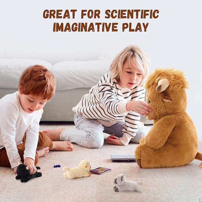 - Precious Companion For Children: Bring this highland cow plush toy home to your kids! Mommy stuffed highland cow and 3 different colored small cows will help kids learn more about farm animals and inspire them to explore nature. Whether reading or studying, this cute highland cow will always be with him and bring your kids wonderful memories