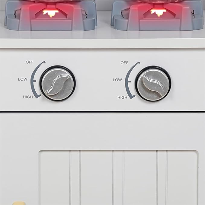 - Simulated Design - Play Kitchen with Lights and Sounds. The baby kitchen stoves feature real cooking set for kids,sounds that simulates a real one with three methods, make pretend play kitchen more lively and interesting, create an immersive play experience for children and kids.