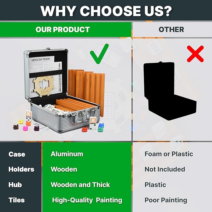 • Mexican Train Set Included: 8 Wooden Tile Holders and Hub, 136 Tiles, 9 Plastic Trains, Score Pad, Instruction, and Aluminum Carrying Case