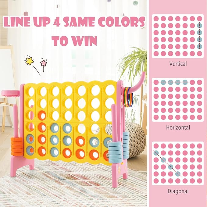 - 【Perfect Gift for Kids】: Our colorful giant game toy is the perfect gift for children. Whether it’s holiday or birthday, this 4-in-a-row game set is always a surprise and will keep them entertained for hours. The rules are very simple and children can learn them quickly. Besides, through this game, children's motor skills, hand-eye coordination and cognitive skills can be greatly improved.