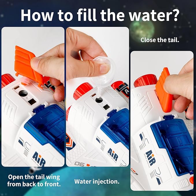 - Music、Lights and Spray - First we can disassemble the tail of the aircraft, then fill it with water and seal it. Press the orange button, and it will produce the sound of takeoff, the light of fire, and the gas jet at launch, which can truly restore the scene of the space shuttle launch. This space adventure craft not only entertains, but also promotes sensory stimulation for children