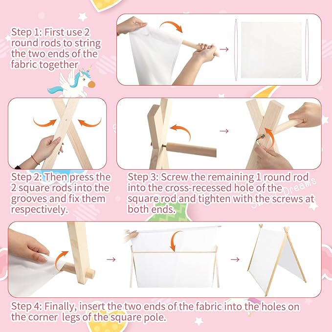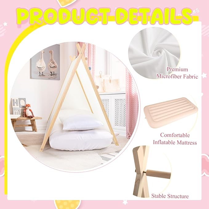 - Easy to Assemble: each teepee tent is equipped with 7 wooden poles, you can complete the assembly according to the grooves and holes, first thread 2 of the round poles into the holes at both ends of the fabric, and then insert all round rods into 4 square rods respectively, finally secure the top round rod with the provided screw nails; The air mattresses, fitted sheets and pillows can be easily used, after the interior of the tent is arranged, your children can get a wonderful space