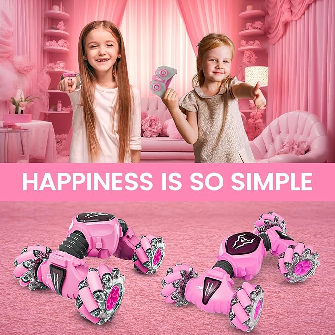 Tecnock Remote Control Car RC Cars for Girls, 2.4GHz 4WD Gesture Sensing RC Stunt Car Toys - 360° Rotating Double Sided Hand Controlled RC Car with Lights, Gifts for Kids, Pink