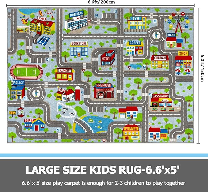 - 【Colourful Car Road Kids Carpet for Playroom】:This traffic road rug is a clever combination of blue and gray,and decorated with multiple patterns such as police station,school,hospital,bookstore, laundry,fire station,church,gas station,bank,etc.So that children can learn a lot of knowledge while playing.