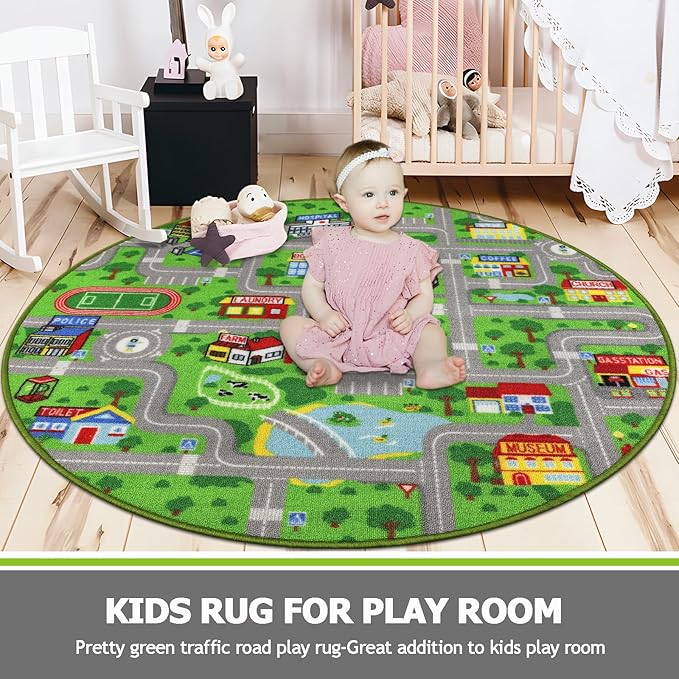 Capslpad Green Car Road Kid Rug Carpet Playmat for Playoom Traffic Road Kids Play Mat for Toddler Non Slip Washable City Map Race Track Carpet Rug for Kids Room Bedroom Nursery Room Decor,4'x4'