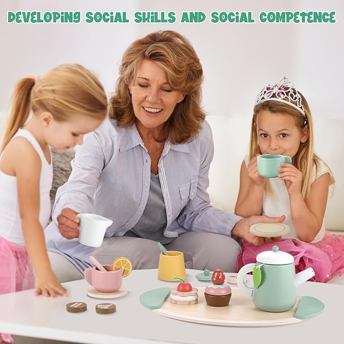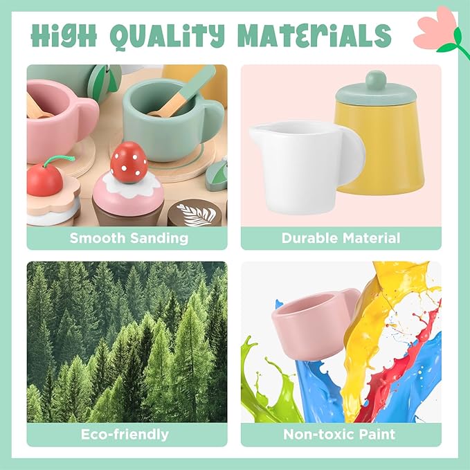 - 【Wooden Tea Set & Coffee 2 in 1】Our wooden tea set is a coffee and afternoon tea 2-in-1 tea set that is a great way for kids to enjoy afternoon tea party time with family or friends. It also promotes children's social, emotional and motor skills; enhancing imagination and creativity in conversation.