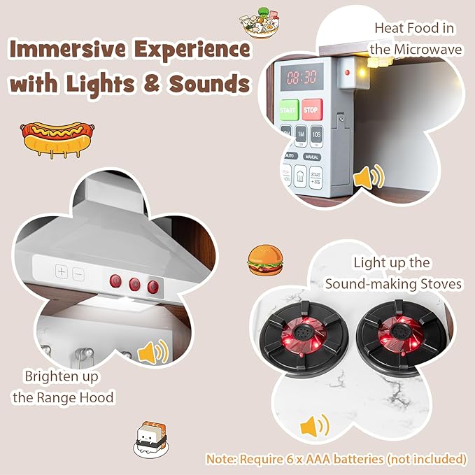 - 【Realistic Lights & Sounds】Our kids play kitchen has multiple light and sound effects to offer kids an immersive cooking experience. Your little chef can heat food in the microwave, brighten up the range hood and light up the sound-making stoves. Note: 6 x AAA batteries are required, but not included.