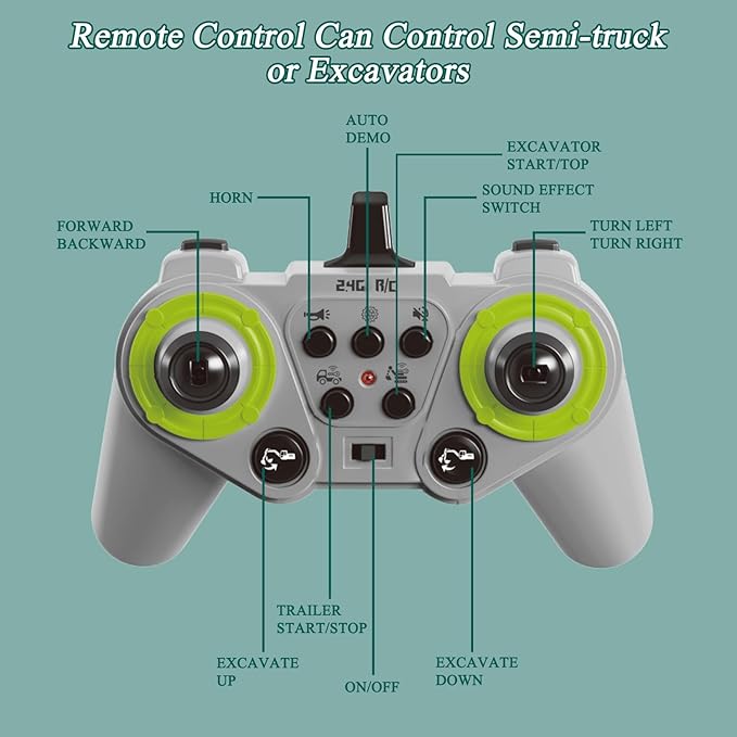 - 【11 Channel Full Function】This RC semi truck accurately simulates the look and operation of a real truck. It can go forward/backward, turn left/right, sound effects on/off, speaker and auto presentation functions. The remote control excavator can go forward/backward, turn left/right, bucket up and down.