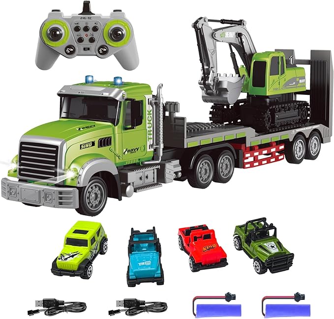 - 【Playing with Construction Vehicles】This 1:12 scale remote control truck measures 24 inches in length and comes with a remote control excavator. It has the capability to drag various types of vehicles, such as cars, excavators, fire trucks, bulldozers, and dump trucks. This versatility allows for imaginative play and creates endless possibilities for kids to explore different construction scenarios.