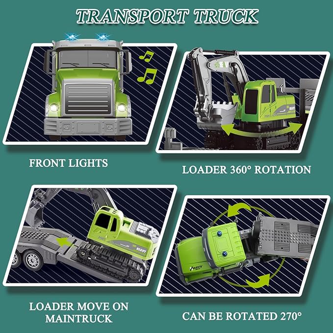 - 【Powerful 2.4GHz Transmission】Equipped with a robust engine and a 2.4GHz transmitter, this RC truck offers strong power and precise control. It can effortlessly tow various vehicles and has a remote control distance range of up to 100 feet. The remote control has two modes, can be operated separately to control the excavator and trailer, so that players experience the real driving fun.