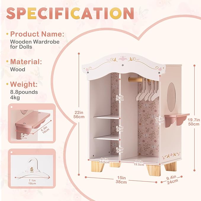 • Interactive Play: The mirrored vanity adds glamour and creates moments of imaginative play as children admire their dolls' stylish looks. Suitable for ages 3 and up, doll closet encourages creativity, organization, and role-playing in children.