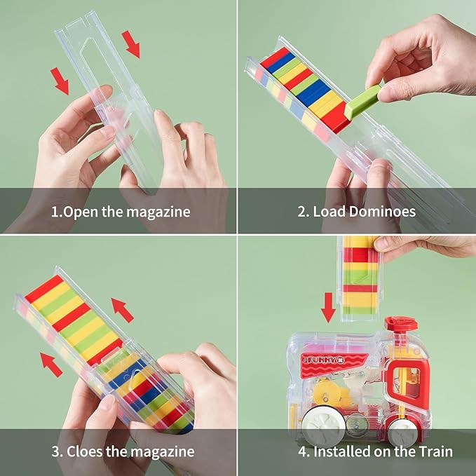 - 【Sensory Learning】This Upgraded Domino Train features a transparent shell design, allowing a clear observation of the internal gear mechanism. With the addition of warm yellow lights and crisp bell sounds, it not only enhances visual effects and auditory experiences but also provides an excellent learning opportunity for children to explore the gear operation mechanism.