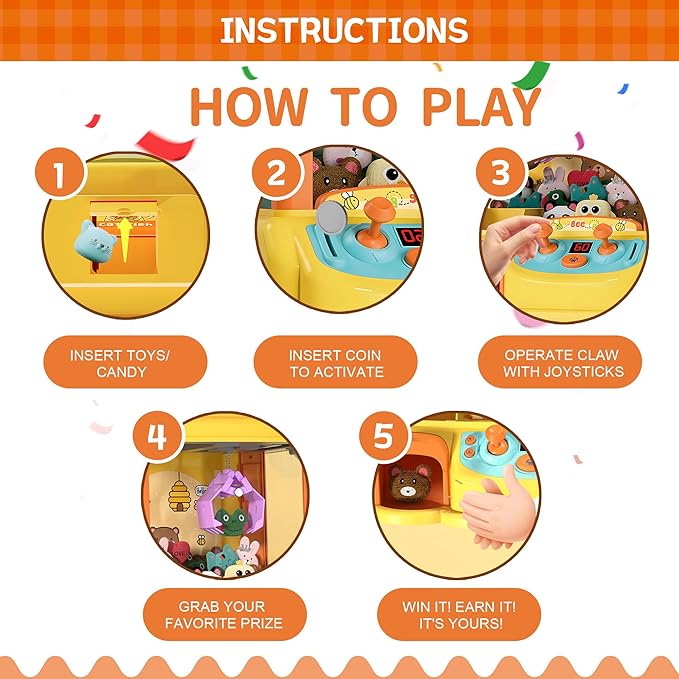 - Easy to Use & 360° Joystick Control: Kids can master the game in no time! Simply insert a coin, maneuver the joystick, and try to grab their favorite prize before the 60-second timerruns out. The mini claw machine for kids helps improve hand-eye coordination and patience.