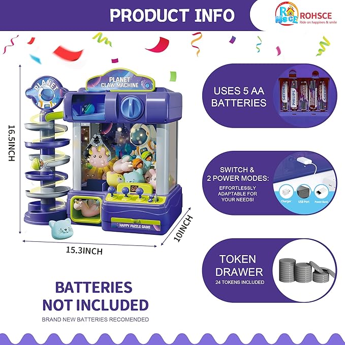 - Safe, Durable & Ready to Play Anywhere: Made from durable ABS plastic with smooth, rounded edges, this kids claw machine is built to handle hours of enthusiastic play. The reinforced claw offers a strong grip to pick up toys of various sizes. Power it with the included USB cable or 5 AA batteries (not included) — perfect for use at home, during travel, or in the classroom. Play safely, anytime, anywhere.