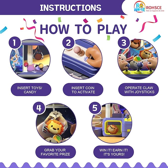 - Real Arcade Experience at Home: Designed with a colorful joystick and smooth 360° controls, this claw machine mimics real arcade gameplay. Includes sound effects, LED lights, and a mute button option — ideal for family fun, friendly competitions, and quiet playtime too.