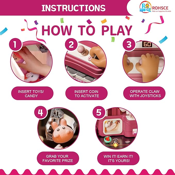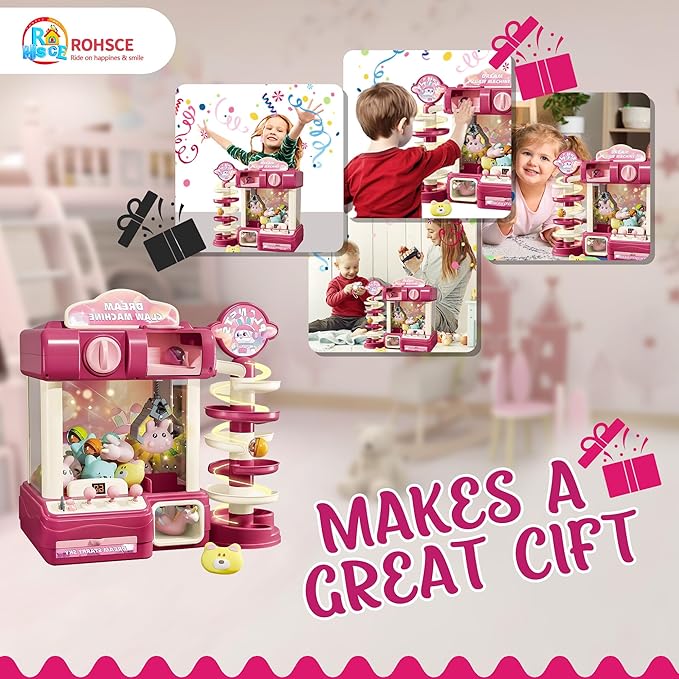 - 【Dream Claw Machine in Pink】This large claw machine for kids features a dreamy pink color, rotating claw, joystick controls, and sparkly lights. Designed for girls who love surprises, cuteness, and fun!