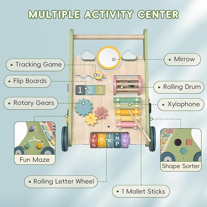 - DEVELOPMENTAL BENEFITS: Give the gift of adventure and learning with our Wooden Baby Walker. More than just a tool for learning to walk, it is a source of endless fun and imagination. Its engaging features and bright colors captivate your child's attention, encouraging exploration and active play