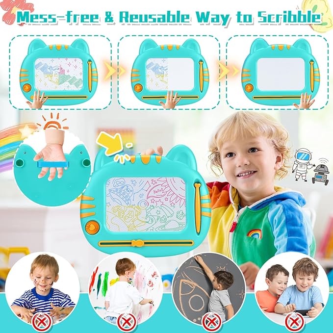 - Mess-Free & Reusable Doodle Board: The magnetic drawing board for toddlers 1-3 offers a clean and eco-friendly drawing alternative to using paper, crayons, pigments, ink, and pencils, ensuring a clean and hassle-free drawing experience for toddlers. The toddler drawing board features 4 vivid color zones (Red/Blue/Green/Yellow) to enhance a vibrant & engaging children's drawing. The smooth gliding eraser pole easily erases in a second for endless redraws, providing hours of drawing fun for kids