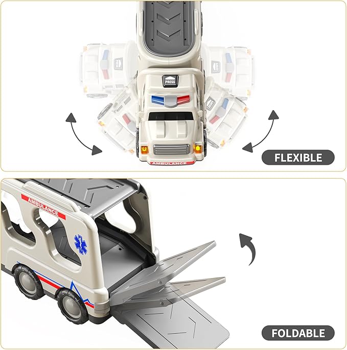 - Education Value: City vehicle toy set has educational value. Large ambulance has light and sound. The vehicle is suitable for parent-child education and cultivates children's cognitive ability, imagination and creativity and indoor games and outdoor toys